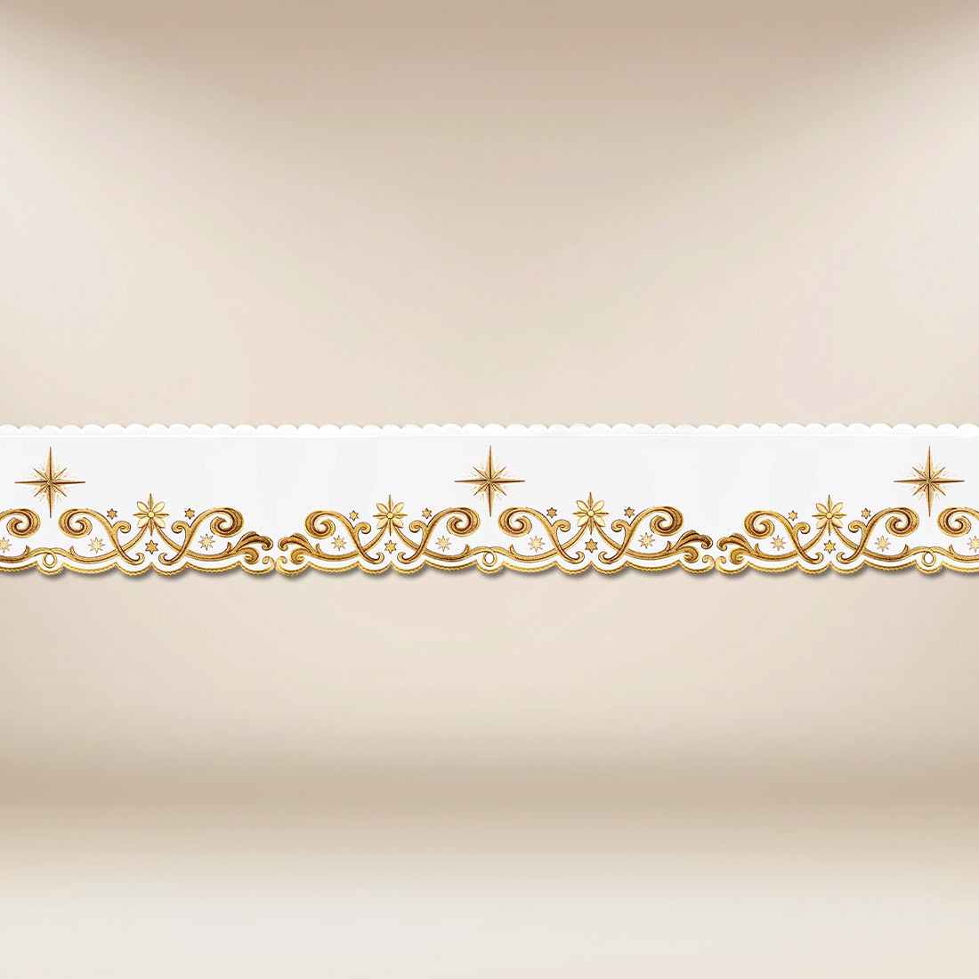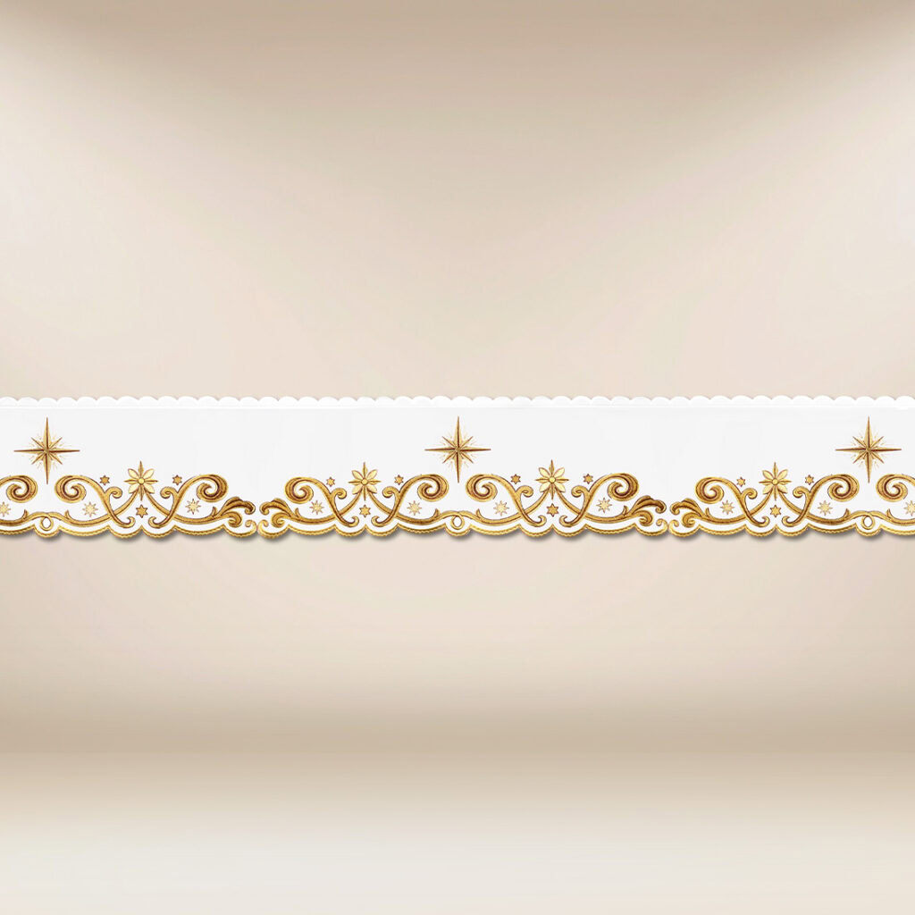 Pizzo ricamato natalizio „Sacro Natale” è un elemento tessile unico che completa splendidamente la decorazione della tovaglia durante la celebrazione della liturgia. Ispirato al canto angelico e alla gioia natalizia, introduce nella spazio ecclesiale un delicato e solenne accento. Il pizzo si adatta perfettamente sia al periodo di Natale che durante le celebrazioni solenni, sottolineando il carattere elevato della liturgia. Grazie all’altezza di 19,50 cm, si armonizza con la tovaglia, costituendo una finitura estetica per l’altare.