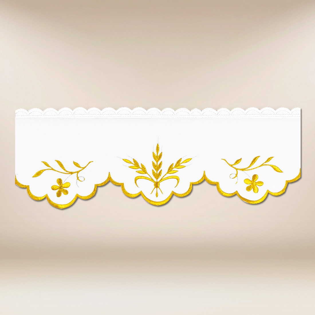 La struttura del pizzo è leggera, fluida e morbida, permettendo al materiale di posarsi splendidamente sui bordi della tovaglia o della tovaglietta d’altare. Il motivo del ricamo è equilibrato – decorativo, ma non eccessivo, consentendo di mantenere la gravità liturgica e la purezza della forma. Il delicato accento dorato del ricamo introduce nobiltà, rimanendo al contempo conforme al canone classico della decorazione utilizzata negli spazi sacri. Questo tipo di pizzo sottolinea perfettamente l’importanza delle celebrazioni solenni, ma si adatta altrettanto bene al servizio quotidiano, conferendo al presbiterio un carattere uniforme, ordinato ed estetico.