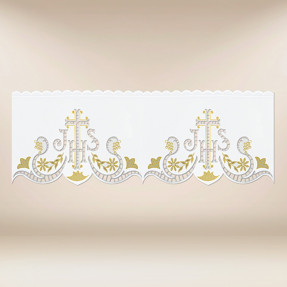 Pizzo ricamato con IHS “Turyński” è una decorazione accuratamente elaborata, che completa splendidamente la tovaglia d’altare e porta nello spazio liturgico eleganza e armonia spirituale. L’accento centrale della composizione è il simbolo IHS, collocato tra ornamenti vegetali, conferendo all’insieme un’espressione sacra e solenne. La combinazione di linee delicate e proporzioni fa sì che il pizzo si adatti perfettamente durante la celebrazione della Messa, l’adorazione e importanti cerimonie parrocchiali.