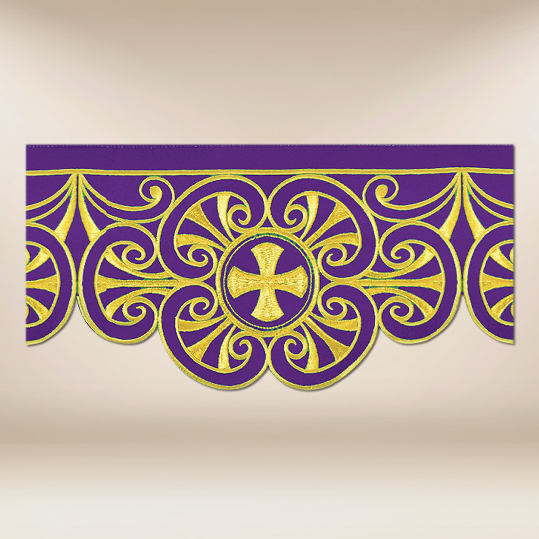 Pizzo ricamato sacro viola 590cm. Il motivo centrale della croce, circondato da un elaborato disegno ricamato, conferisce al pizzo un carattere decorativo di significato simbolico, mantenendo al contempo la giusta armonia e il giusto equilibrio liturgico.