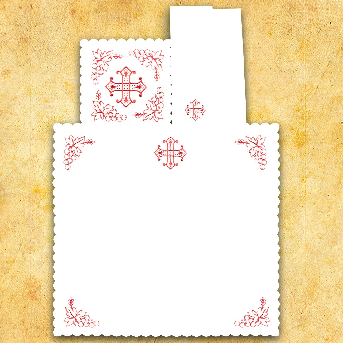 Il motivo decorativo centrale del set è la croce, ricamata in tonalità rossa e circondata da delicati elementi di grappoli d’uva. La croce ricorda il sacrificio salvifico di Cristo, mentre i grappoli d’uva rimandano all’Eucaristia – pane e vino che diventano Corpo e Sangue del Signore. Il rosso del ricamo simboleggia il martirio, l’amore e il sacrificio, rendendo il set perfettamente adatto alle celebrazioni legate alla Passione del Signore, alle festività degli apostoli e dei martiri.