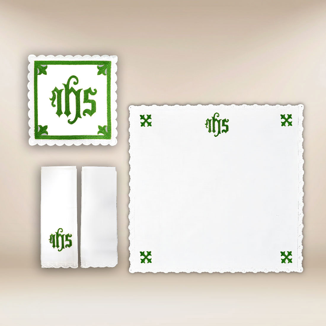 Il set è composto da palla ricamata, corporale ricamato, purificatoio e asciugamano, creando un equipaggiamento completo e funzionale per il calice messa. Il motivo decorativo centrale è il monogramma IHS, che si riferisce inequivocabilmente al nome di Gesù Cristo e al mistero dell’Eucaristia. La disposizione armoniosa del ricamo conferisce all’insieme equilibrio e ordine, caratteristiche dello stile classico cattedrale.