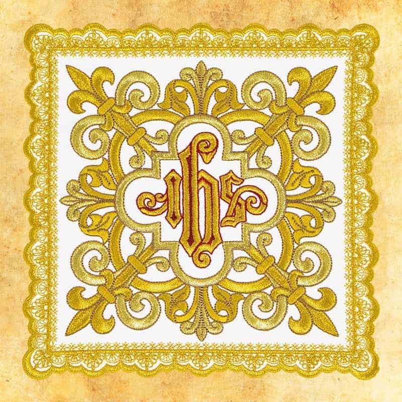 L’elemento decorativo centrale è il monogramma IHS, da secoli simbolo del Santissimo Nome di Gesù. È racchiuso in una cornice ornamentale elaborata con un layout simmetrico, che conferisce all’insieme un carattere dignitoso e rappresentativo. Tale motivo favorisce la concentrazione e la preghiera, richiamando al contempo la secolare tradizione dell’ornamentazione liturgica, in cui simbolo e forma creano un’unità coerente.