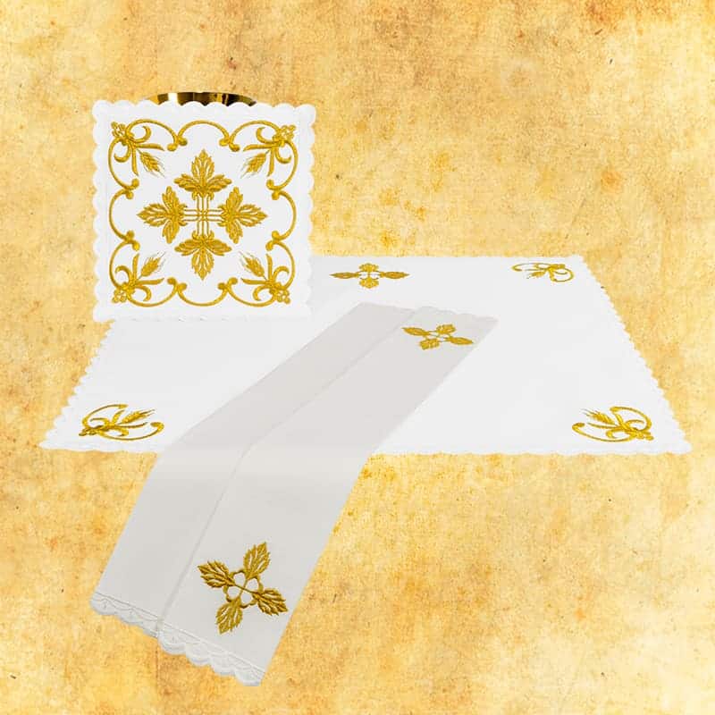 Il purificatoio e il fazzoletto sono realizzati in tela di cotone naturale (100% cotone), apprezzata per la sua ottima capacità di assorbimento e morbidezza, essenziali nell’uso liturgico quotidiano. La palla e il corporale sono realizzati in tessuto poliestere bianco (100%), che garantisce durata, resistenza alle macchie e un aspetto estetico nel tempo. Il set può essere lavato in lavatrice a 30°C, senza l’uso di ammorbidenti.