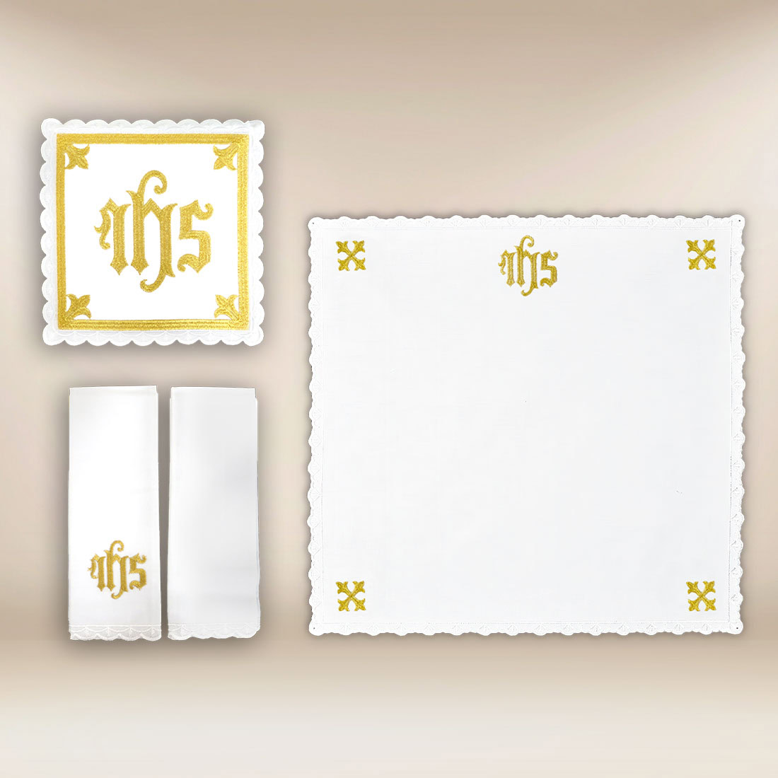 Il tema principale del set è il cristogramma IHS, presente da secoli nella tradizione della Chiesa come segno del nome di Gesù e della Sua reale presenza nell’Eucaristia. Collocato in una cornice decorativa e geometrica, richiama l’ordine architettonico e il maestoso delle cattedrali, introducendo nella liturgia un’atmosfera di gravità, concentrazione e profondità spirituale. Sottile dettagli di ricamo completano la composizione, mantenendo un equilibrio tra ornamento e sobrietà liturgica.