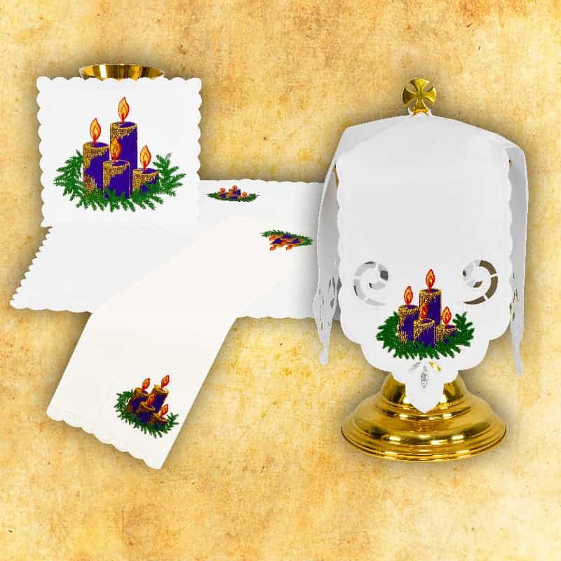 Set di biancheria per calice avventizia Avvento è stato progettato per la liturgia del periodo dell’Avvento – tempo di attesa, vigilanza e preparazione interiore per la Nascita di Cristo. Il motivo centrale del ricamo sono le candele avventizie, il cui fiamma simboleggia la crescente luce della speranza, la presenza di Dio e l’illuminazione spirituale dei cuori dei fedeli. La composizione del ricamo è chiara e, allo stesso tempo, piena di gravità liturgica, inserendosi perfettamente nel carattere delle celebrazioni avventizie.