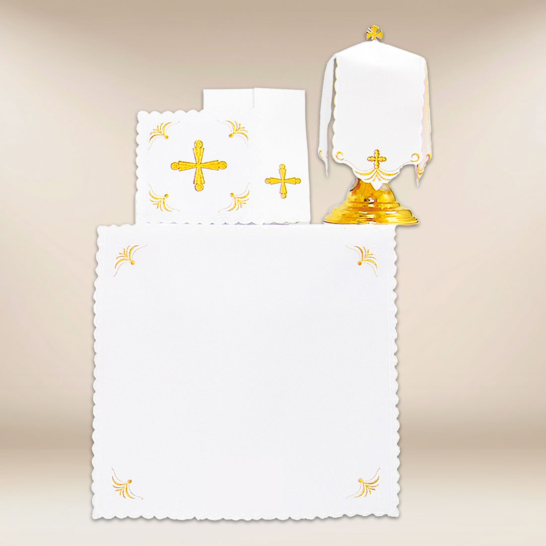 Il tema principale del ricamo è la croce, segno di salvezza e offerta di Cristo, completata da sottili decorazioni di carattere classico. Le decorazioni disposte su palla, corporale e conopeo copri pisside creano una composizione coerente e leggibile, sottolineando la dimensione sacra della liturgia senza eccessiva decoratività. Grazie a ciò, il set mantiene uno stile senza tempo, adatto ai diversi periodi dell’anno liturgico.