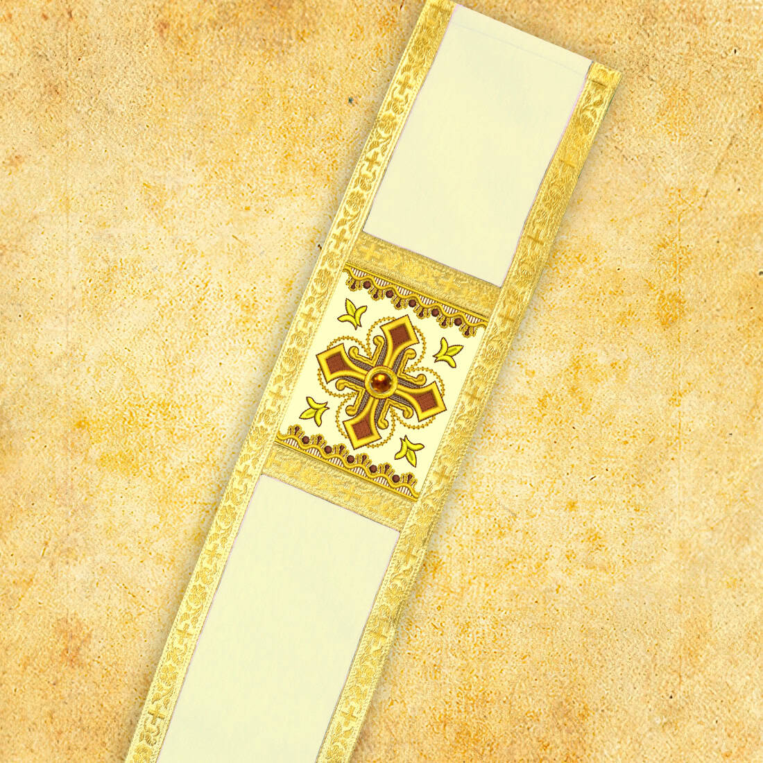 L’elemento centrale della veste è il motivo floreale ricamato con croce — realizzato con filo dorato di eccezionale morbidezza e durata. Gli ornamenti sono equilibrati, eleganti e pieni di simbolismo liturgico, e le pietre applicate a mano aggiungono un delicato splendore visibile alla luce delle candele dell’altare. Grazie a ciò, la stola si presenta in modo straordinariamente solenne, senza perdere la sobrietà liturgica.