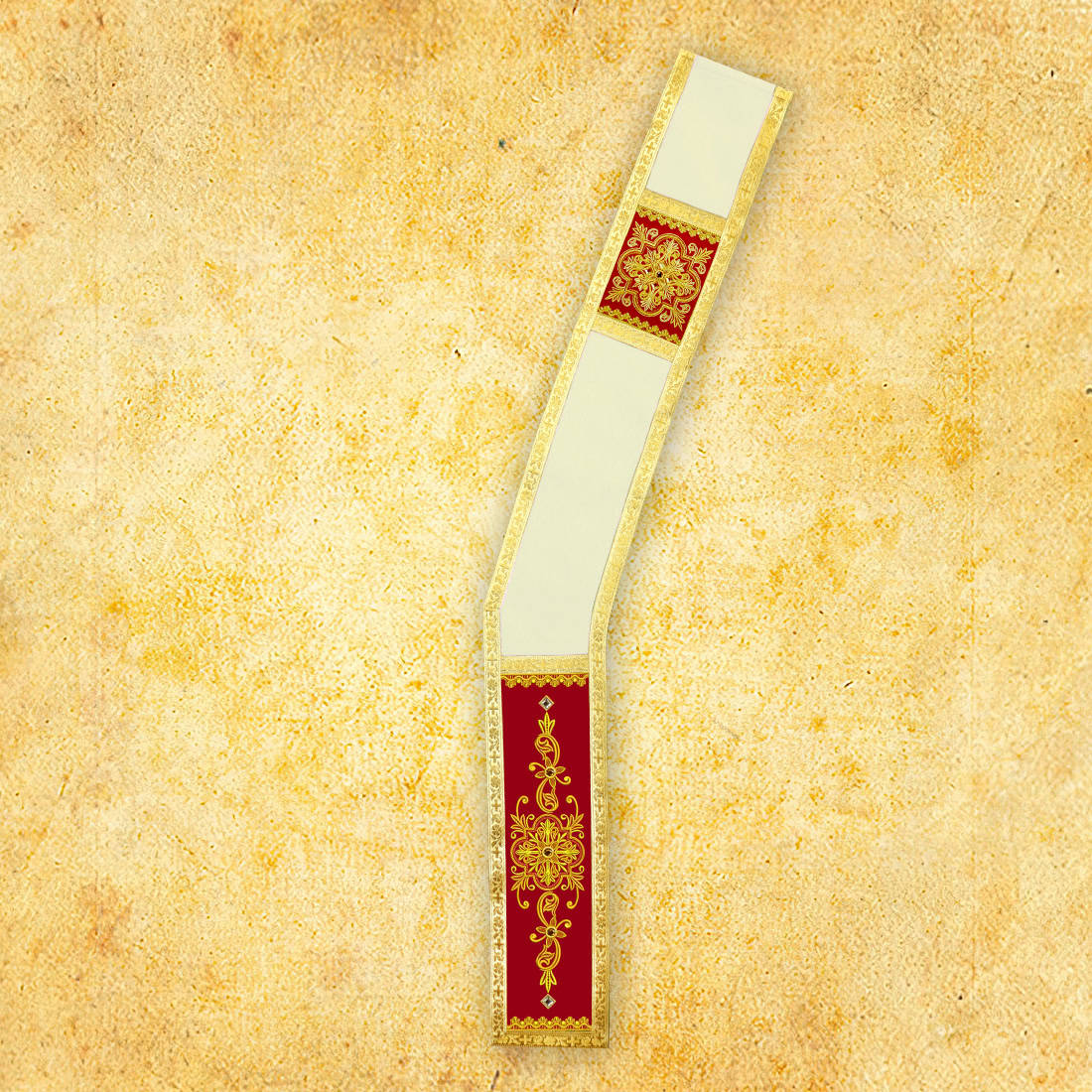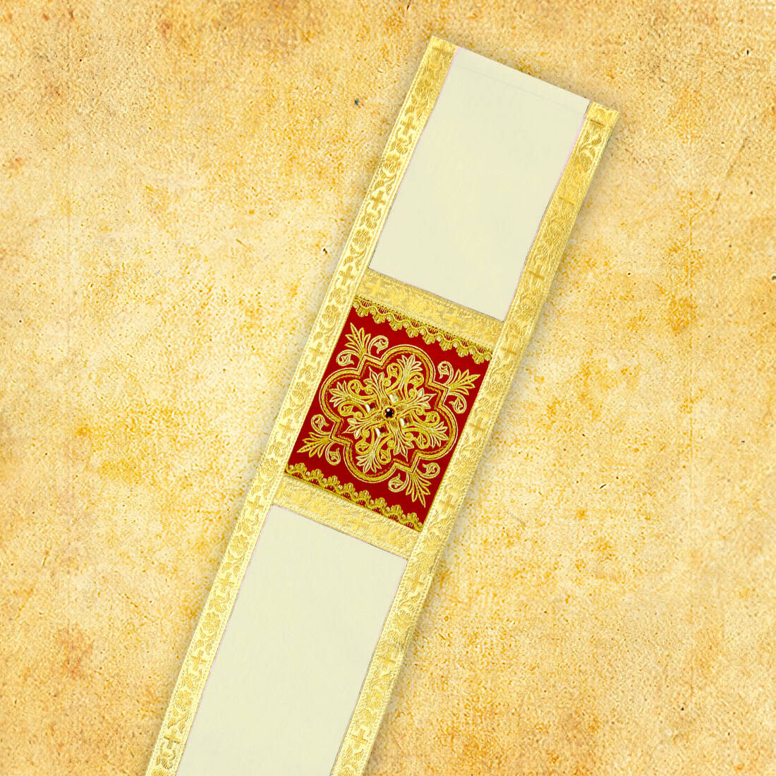 Il tessuto principale in tonalità ecru è morbido, delicato al tatto e resistente alle pieghe, il che consente alla stola di presentarsi esteticamente anche dopo un uso intenso. La combinazione di una tonalità chiara con pannelli bordò e ricamo dorato crea una composizione classica, ricca di simbolismo sacro e di eleganza senza tempo.