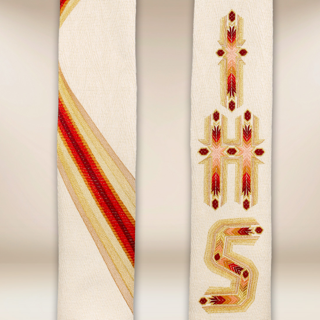 Al centro della decorazione si trovano i simboli ricamati IHS e la croce. Il cristogramma IHS è presente da secoli nell’arte sacra come professione di fede e promemoria del nome di Gesù Cristo. La croce, invece, rappresenta il segno più importante del cristianesimo, simboleggiando il sacrificio, la salvezza e l’amore di Dio per l’uomo. Il ricamo preciso, realizzato con attenzione ai dettagli, garantisce la durata delle decorazioni e un aspetto estetico per lungo tempo di utilizzo.