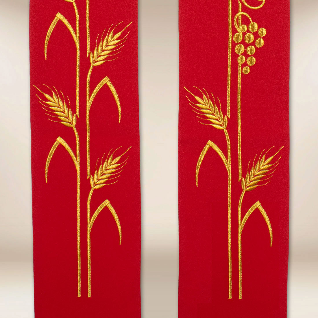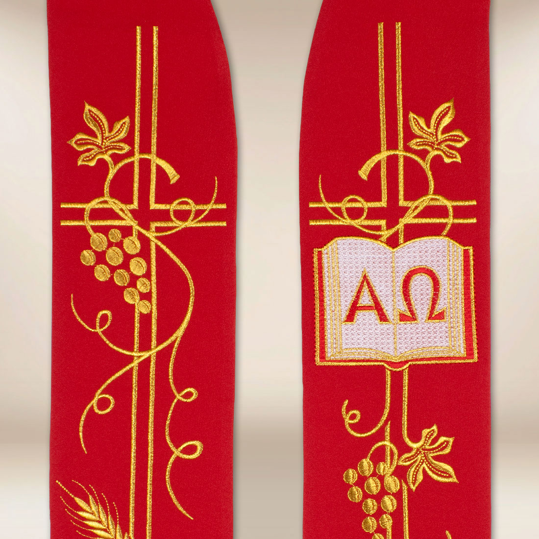 Sottile e precisa, la decorazione è disposta in modo simmetrico, guidando lo sguardo verso gli elementi più importanti della simbologia. Il filo dorato contrasta splendidamente con lo sfondo intenso, creando un effetto di eleganza straordinaria visibile anche da una parte più lontana del presbiterio. La stola si adatta perfettamente durante le Messe, le adorazioni eucaristiche, i ritiri e le celebrazioni parrocchiali a tema della Parola di Dio o del mistero dell’Altare.