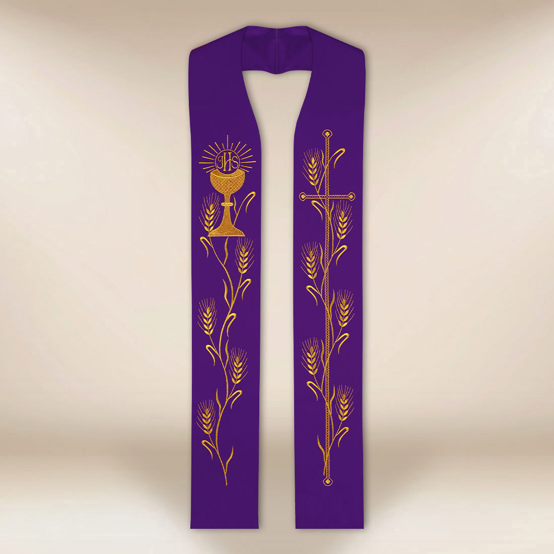 Stola ricamata “Calice con Spighe” è una bella veste liturgica simbolica, che mostra in modo unico la teologia dell’Eucaristia attraverso un ricamo ricco e preciso. Da un lato della stola si trova un calice eucaristico con l’ostia, circondato da un delicato bagliore, e dall’altro un elegante croce con spighe di grano ricamata. Entrambi i motivi richiamano il sacrificio di Cristo, il pane della vita e l’abbondanza spirituale, la cui fonte è l’Eucaristia. La veste si adatta perfettamente alle celebrazioni delle Messe, specialmente quelle di carattere penitenziale ed eucaristico.