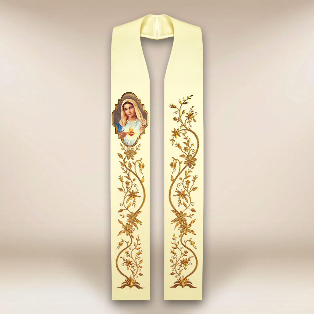 Stola con immagine Cuore di Maria è un paramento liturgico in cui la simbologia della spiritualità mariana è stata espressa attraverso l’armonica combinazione di un elegante ricamo e una vivida rappresentazione sacra. L’immagine del Santissimo Cuore di Maria, segno d’amore, fedeltà e cura materna, conferisce alla celebrazione una particolare dimensione di preghiera e contemplazione. L’immagine fotografica è stata trasferita sul tessuto con una tecnologia che garantisce transizioni tonali naturali, profondità cromatica e durata, permettendo così alla rappresentazione di mantenere la propria estetica e vivacità anche con un uso liturgico intenso.