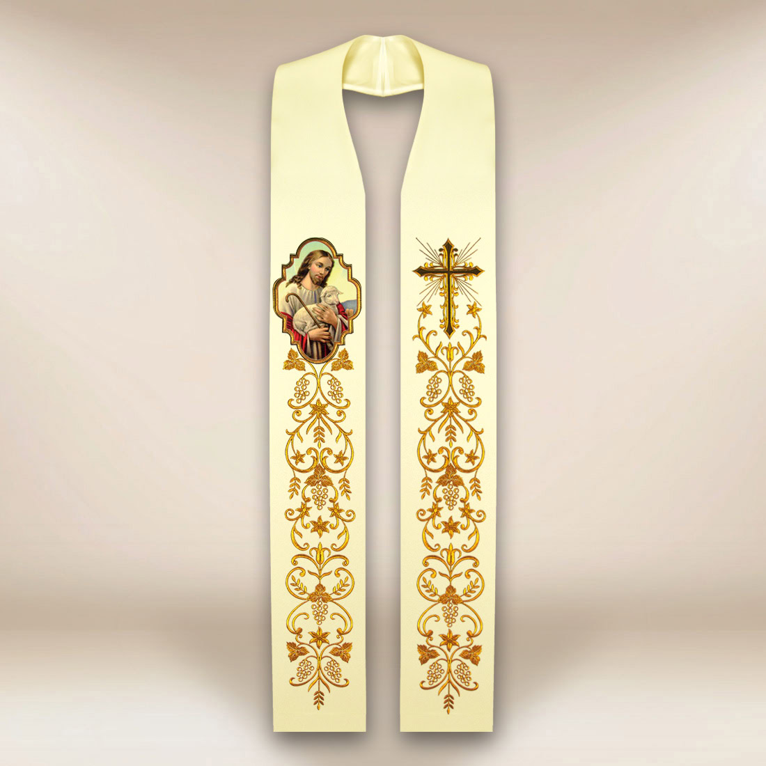 Stola con immagine Gesù Buon Pastore rappresenta un’unione unica tra tradizione liturgica e profondo messaggio evangelico. Il motivo di Cristo come Buon Pastore simboleggia da secoli la cura, la guida e la protezione spirituale del popolo affidato, perciò questo paramento sottolinea particolarmente la dimensione pastorale del ministero sacerdotale. L’immagine centralmente collocata è stata realizzata con una tecnologia di trasferimento permanente dell’immagine sul tessuto, che consente di mantenere la chiarezza dei dettagli, le sottili transizioni tonali e un’alta resistenza all’uso liturgico.