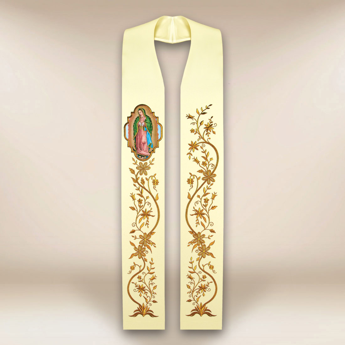 Stola con immagine della Madonna di Guadalupe è stata preparata come veste liturgica destinata alle celebrazioni mariane, in cui ha particolare significato la spiritualità delle apparizioni di Guadalupe — segno di speranza, protezione e presenza materna di Maria nella vita della Chiesa. L’immagine fotografica della Madonna, collocata centralmente, è stata trasferita sul tessuto utilizzando una tecnologia che garantisce durata e una sottile riproduzione dei dettagli. Grazie a ciò, l’immagine conserva le transizioni tonali naturali, la chiarezza del disegno e la profondità della composizione, rimanendo un elemento leggibile ed estetico della veste anche con un uso frequente.