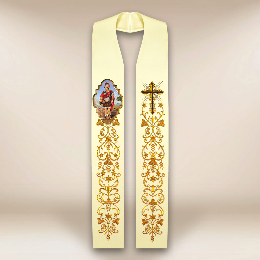 Stola con immagine di S. Floriano è un paramento dal chiaro carattere simbolico, che unisce il messaggio spirituale all’eleganza della forma liturgica e alla cura dei dettagli. La figura di S. Floriano, venerato come patrono dei pompieri e di tutti coloro che portano aiuto al prossimo, ricorda il coraggio, la disponibilità al sacrificio e il servizio cristiano verso il prossimo. L’immagine fotografica, collocata centralmente, è stata realizzata con una tecnologia di trasferimento permanente dell’immagine sul tessuto, che consente di mantenere la vivacità dei dettagli, la profondità dei colori e un’alta resistenza all’uso liturgico prolungato.