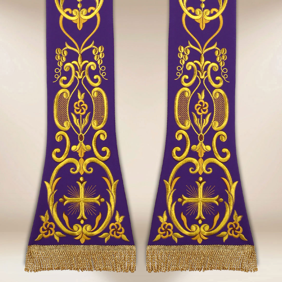 La veste è realizzata in tessuto di alta qualità — una resistente miscela di fibre, che consente alla stola di cadere naturalmente e mantenere una linea elegante durante tutta la liturgia. La finitura sottile in basso, sotto forma di frange, sottolinea lo stile tradizionale del progetto, conferendole leggerezza e raffinatezza.