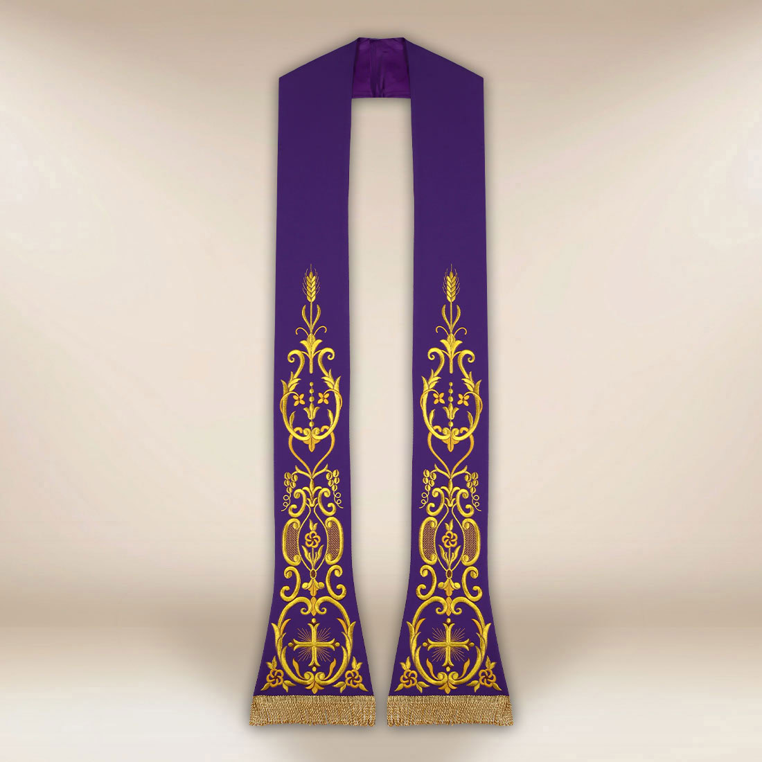 Stola liturgica ricamata con croce è una proposta classica per i sacerdoti che apprezzano la simbolica senza tempo e la finitura elegante. Il motivo centrale della croce è arricchito da ornamenti vegetali, spighe di grano e dettagli stilizzati che conferiscono armonia alla veste sacra. Questo tipo di iconografia si riferisce sia alla Pasqua di Cristo che alla dimensione eucaristica della celebrazione, rendendo la stola un elemento liturgico universale.