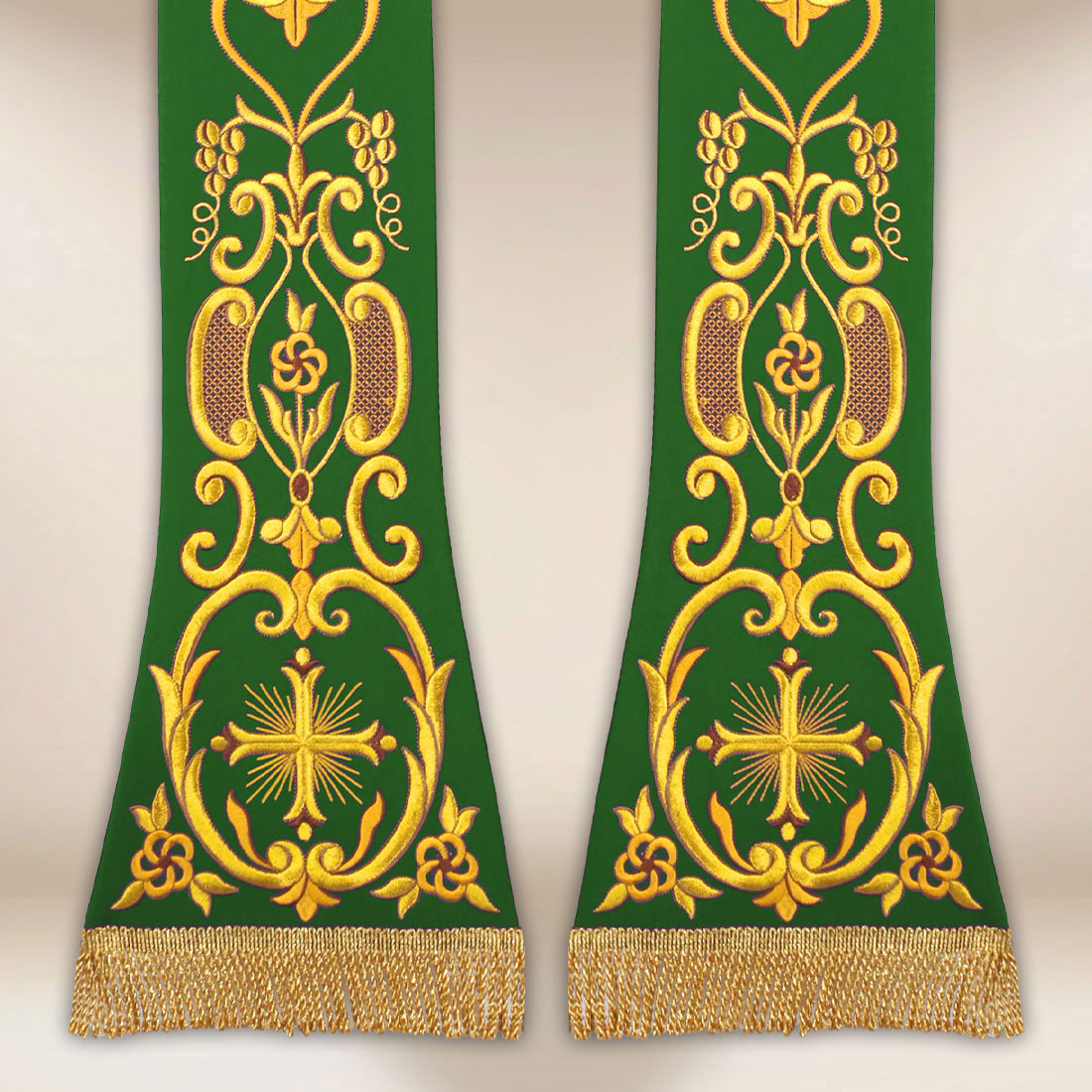 Il tessuto di cui è realizzata la stola è una miscela di fibre accuratamente selezionata che garantisce leggerezza, morbidezza e durata, permettendo così alla veste di adattarsi naturalmente e mantenere un aspetto estetico per lungo tempo. La disponibilità di quattro colori liturgici consente di abbinare la stola ai periodi dell’anno ecclesiastico, creando un’armonia nelle celebrazioni.