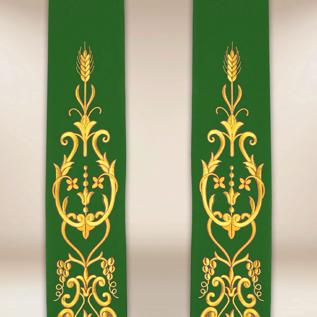 Stola liturgica Croce è una proposta classica per i sacerdoti che apprezzano l’eleganza, la tradizione e una simbolica liturgica ben definita. Il motivo centrale è una croce ricamata, circondata da spighe e grappoli d’uva, che da secoli simboleggiano i doni del pane e del vino – fondamento dell’Eucaristia. La composizione del motivo è stata elaborata simmetricamente, conferendo alla veste armonia e permettendole di presentarsi bene sia in movimento che in posizione statica.