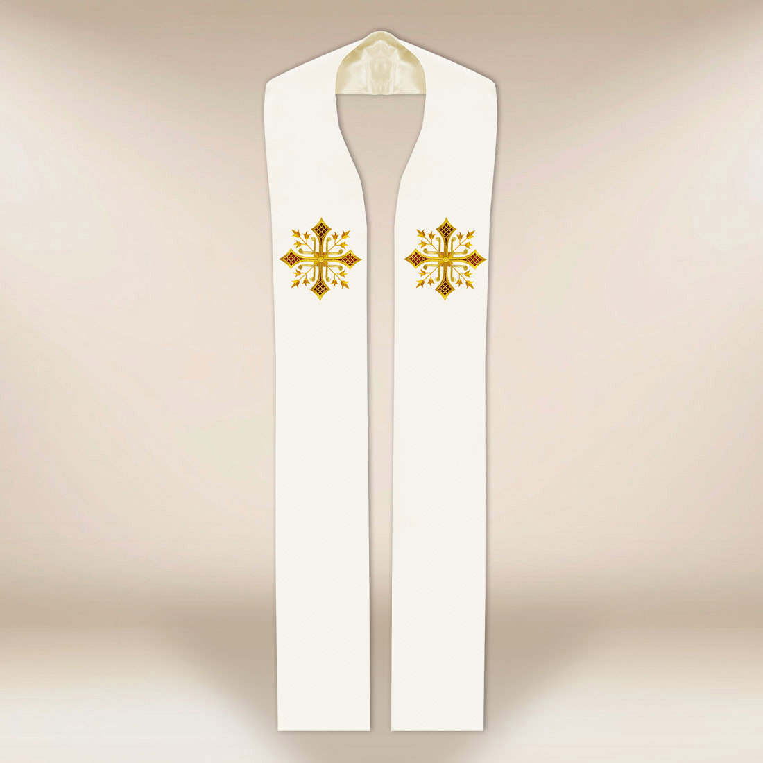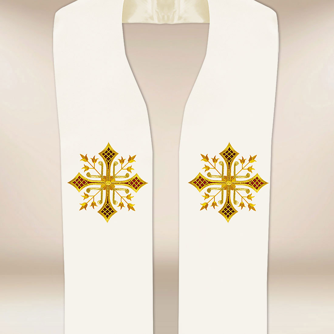 Elegante stola liturgica ecru con motivo della croce è un elemento unico delle vesti sacerdotali, che unisce simbolismo spirituale con bellezza classica e la massima qualità di esecuzione. Realizzata in tessuto di alta qualitàe di straordinaria morbidezza e delicatezza, garantisce comfort, leggerezza e libertà di movimento durante ogni celebrazione liturgica.