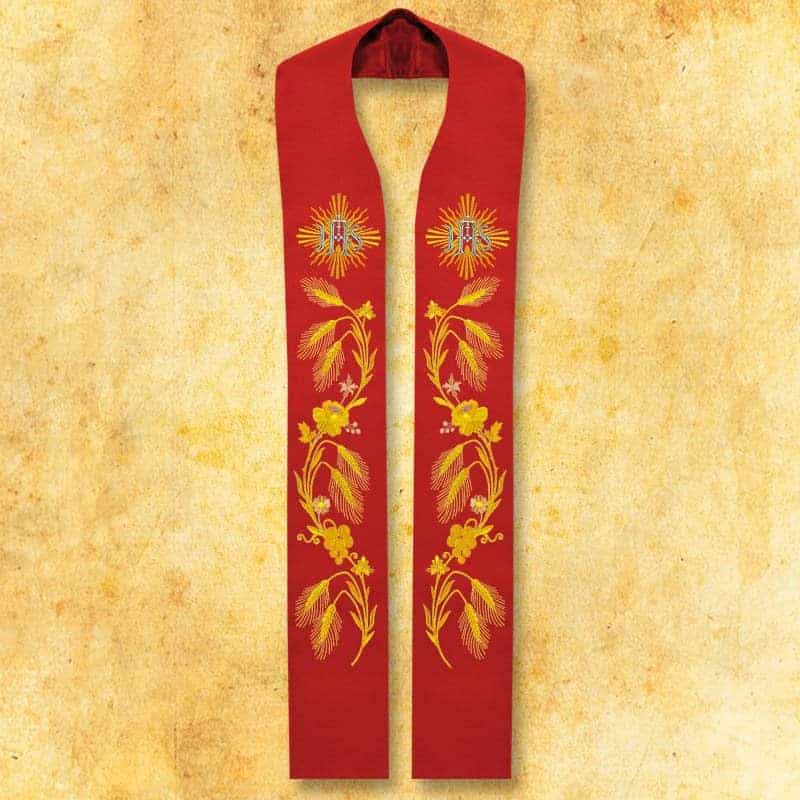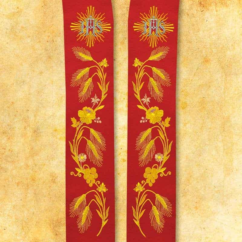La composizione degli ornamenti è formata da kłosy pszenicy e delicati motivi floreali, che da secoli simboleggiano la benedizione divina, i frutti del lavoro delle mani umane e i doni offerti sull’altare. Questi motivi guidano lo sguardo verso la parte superiore della stola, dove è collocato il monogramma IHS radiante – un chiaro riferimento alla presenza di Cristo nell’Eucaristia e il punto centrale di tutta la decorazione. Grazie a ciò, stola ricamata liturgica IHS rossa mantiene una struttura chiara e un equilibrio tra la ricchezza della simbologia e l’eleganza della forma.
