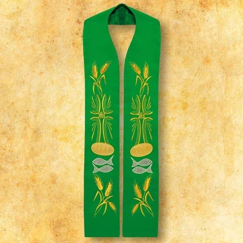 Stola ricamata “Doni” è un’eccezionale veste liturgica, la cui ricca simbologia richiama il miracolo evangelico della moltiplicazione dei pani e dei pesci e il nutrimento eucaristico dei fedeli. Il motivo centrale è costituito da pane e due pesci, circondati da spighe di grano e dal delicato monogramma IHS – segno della presenza di Cristo. Questo ricamo sottolinea in modo chiaro la profondità teologica della celebrazione e guida lo sguardo verso il messaggio spirituale della liturgia.