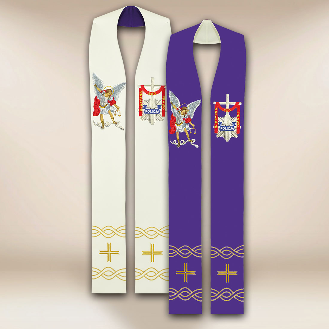 Stola ricamata doppia „Polizia” è un’elegante veste liturgica dedicata ai cappellani della Polizia e ai cappellani delle forze armate. Realizzata in tessuto liturgico di alta qualità, unisce leggerezza, durata e un’ottima vestibilità durante la liturgia.