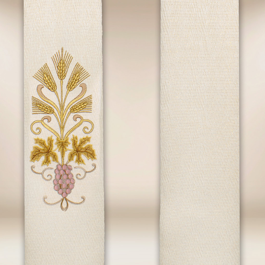 L’elemento decorativo centrale è un ricamo realizzato con precisione, raffigurante il simbolo IHS e motivi di grappoli d’uva e spighe. Il cristogramma IHS, abbreviazione del nome di Gesù, è presente da secoli nell’arte sacra come segno di fede e dedizione a Cristo. I grappoli d’uva e le spighe richiamano direttamente l’Eucaristia – il pane e il vino che diventano Corpo e Sangue di Cristo. Questi motivi simboleggiano anche l’abbondanza dei doni di Dio, l’unità della comunità dei fedeli e la vita spirituale che scaturisce dalla partecipazione ai sacramenti.