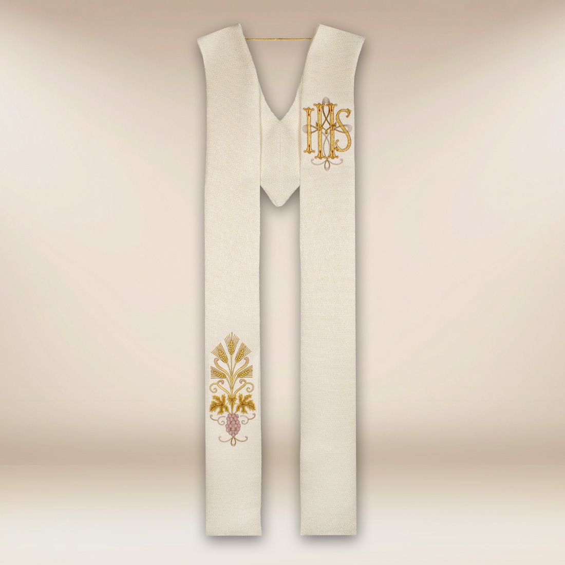 Stola ricamata ecru con IHS, delicatamente intrecciata con filo dorato, è un elemento elegante e simbolico dell’abito ecclesiastico con una ricca e chiara simbologia eucaristica. La forma classica e la scelta accurata dei colori fanno sì che la stola si presenti con dignità e armonia durante le celebrazioni solenni. Il chiaro colore ecru, unito al delicato luccichio del filo dorato, sottolinea il carattere sacro e l’estetica senza tempo.