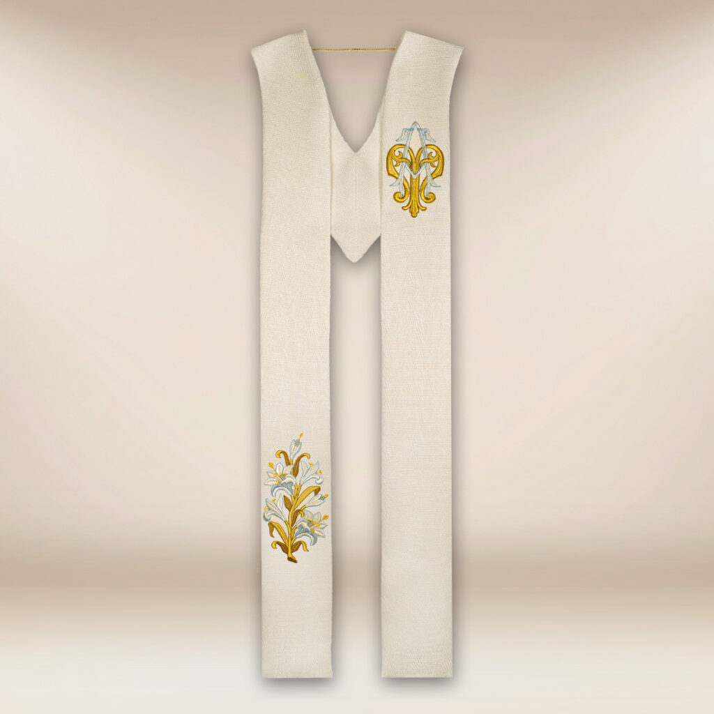 L’elemento decorativo centrale è un ricamo realizzato con precisione che rappresenta simboli mariani – la lettera M e il motivo del giglio. La lettera M richiama il nome della Santissima Vergine Maria, simboleggiando la Sua maternità spirituale, la protezione sui fedeli e la vicinanza a Dio. I gigli, invece, sono simboli di purezza, innocenza e santità di Maria, e sono anche associati alla Sua gioia e alle virtù spirituali. La combinazione di questi motivi conferisce alla stola una profonda espressione spirituale e sottolinea il carattere unico dell’abbigliamento durante la liturgia.