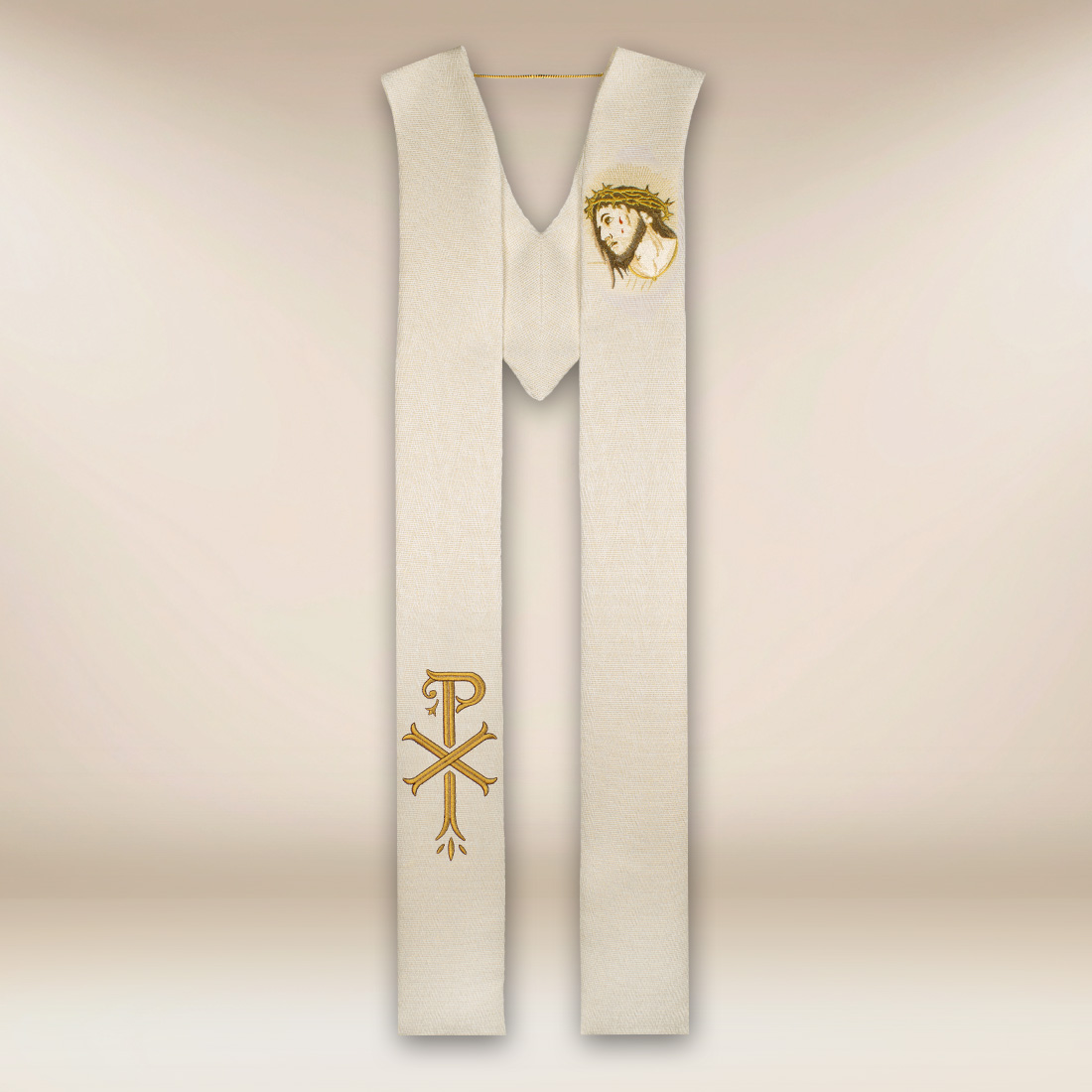 Il colore ecru simboleggia la purezza, la luce e la nuova vita in Cristo. L’intreccio del tessuto con filo dorato conferisce alla stola un carattere nobile e solenne. L’oro nella liturgia rappresenta la gloria di Dio, la luce e la presenza della grazia divina, in armonia con la simbolica teologica della fede cristiana e sottolinea l’aspetto solenne della veste.