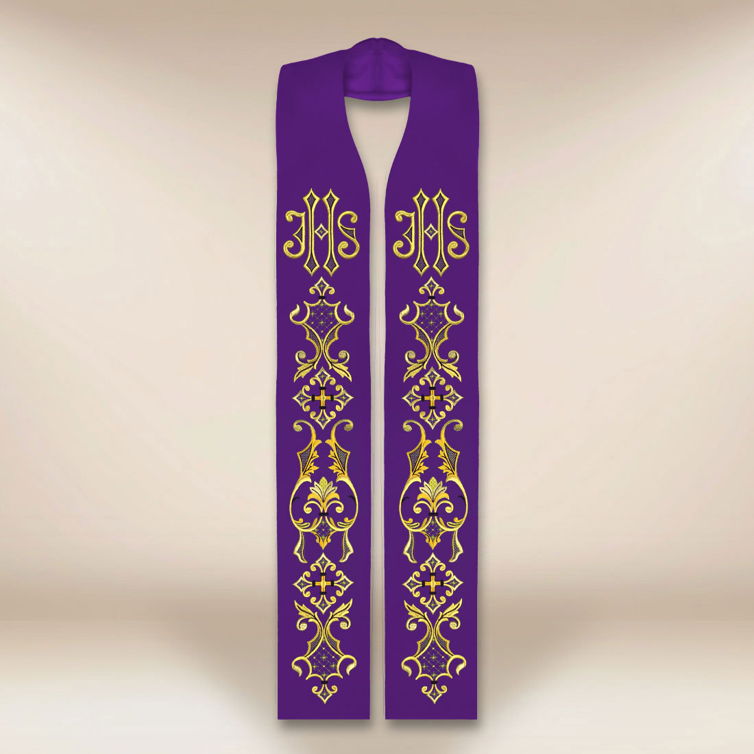 Grazie a un taglio classico e un design universale, la stola si abbina perfettamente a diverse vesti liturgiche – casule e cope di colore viola.