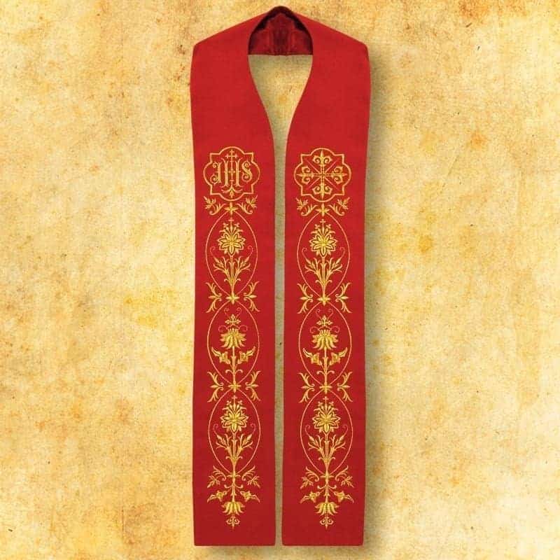 Stola ricamata „IHS” è una proposta classica per i sacerdoti che apprezzano la simbolica tradizionale e l’eleganza del ricamo sacro. Il motivo centrale IHS, noto monogramma del nome di Gesù, sottolinea il carattere sacro della celebrazione e si armonizza con i ricchi ornamenti floreali. Ogni elemento è stato realizzato con grande precisione, rendendo la stola particolarmente dignitosa.