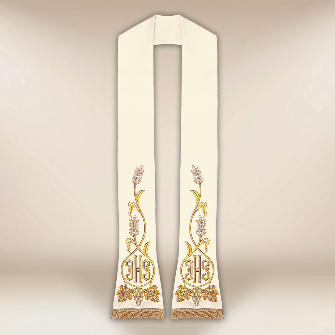 Stola liturgica IHS è un’elegante veste sacerdotale con un chiaro messaggio eucaristico. Il motivo centrale è costituito dal monogramma IHS, uno dei più antichi cristogrammi, presente da secoli nell’arte sacra. Ad accompagnarlo ci sono spighe di grano e grappoli d’uva, che rappresentano perfettamente la simbologia dei doni utilizzati durante l’Eucaristia. La composizione del motivo è armoniosa, delicata e mantenuta in uno stile ecclesiastico classico.