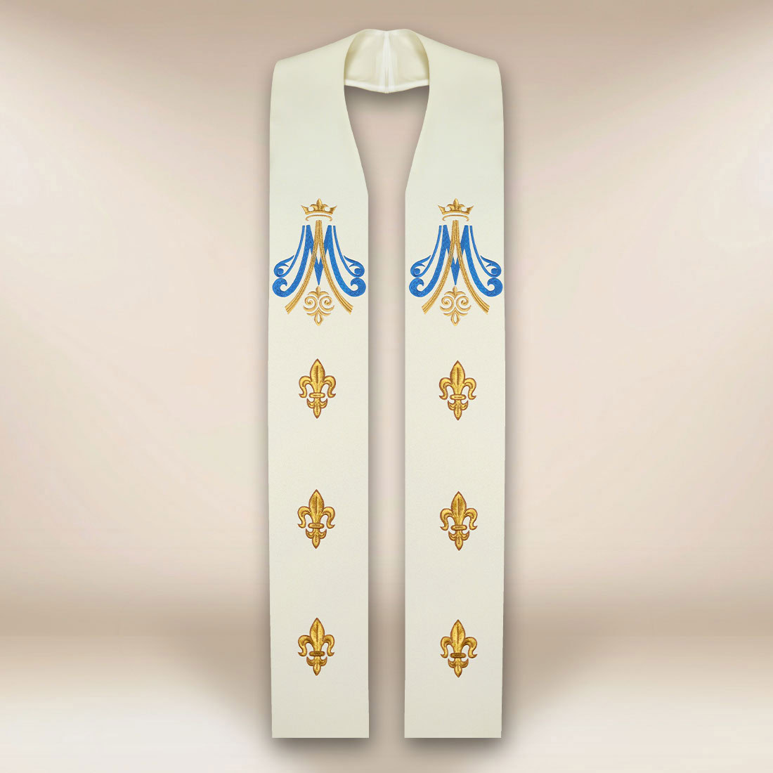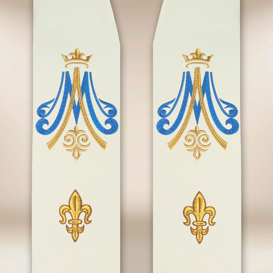 Sotto sono disposti eleganti motivi fleur-de-lis – simbolo di purezza, rinnovamento e spiritualità mariana. La loro disposizione simmetrica conferisce all’insieme un ritmo tranquillo e un carattere classico, rendendo la stola perfetta sia per le celebrazioni mariane solenni che per le Messe quotidiane con un elemento mariano.