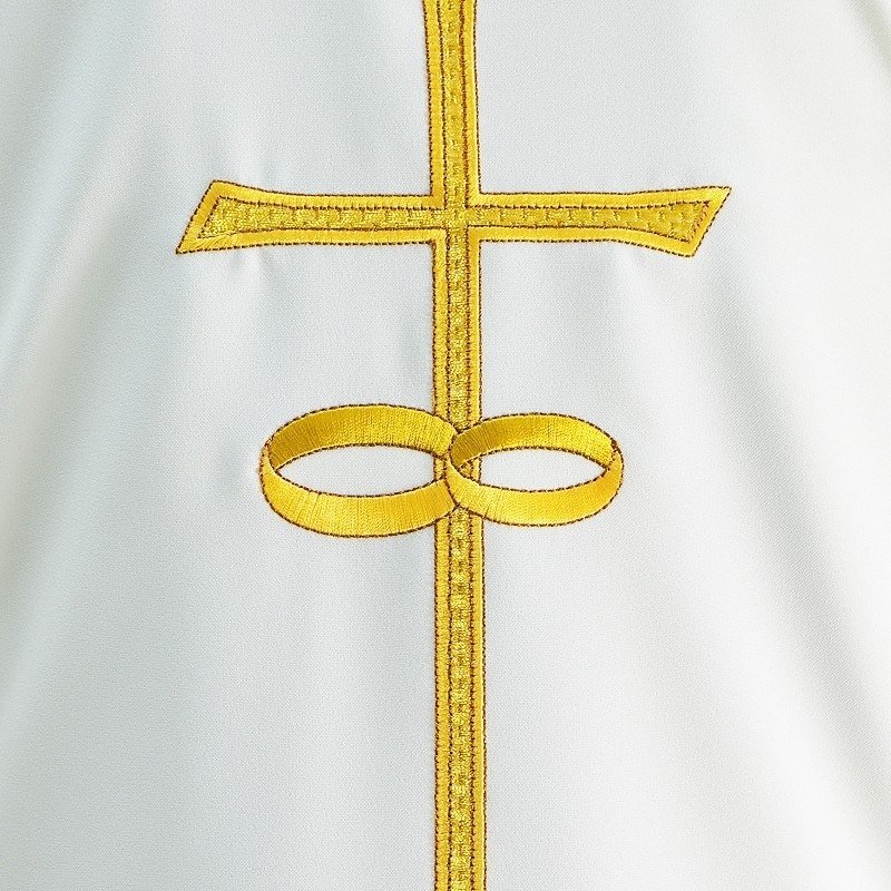 L’accento decorativo centrale del modello è un ricamo simbolico ispirato al sacramento del matrimonio. Il motivo, progettato con attenzione alle proporzioni e alla leggibilità, si integra armoniosamente con il tutto e sottolinea la dimensione spirituale della liturgia. Questa decorazione crea una composizione elegante propria dei modelli definiti come stola nuziale ricamata, che uniscono la simbologia liturgica a un’estetica equilibrata.
