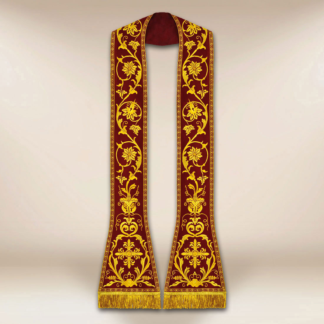 Stola ricamata romana unisce la bellezza classica della liturgia e l’estetica raffinata del ricamo sacro. Un ricco ornamento, basato su motivi vegetali e foglie stilizzate, è stato progettato per creare una composizione armoniosa e simmetrica. Il ricamo si distingue per la profondità dei dettagli e sottolinea perfettamente il carattere della veste, rendendola adatta sia per celebrazioni solenni che per il servizio sacerdotale quotidiano.