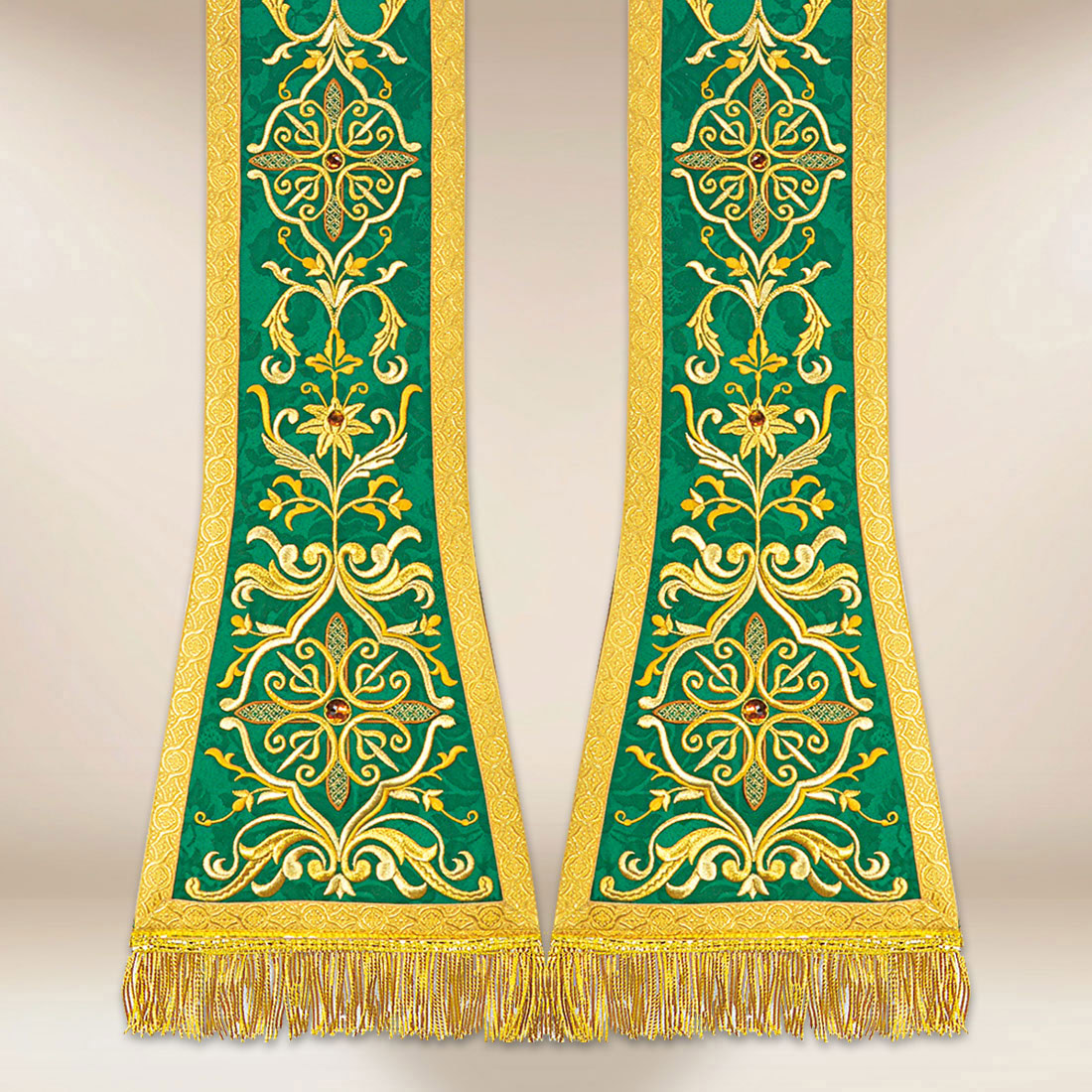 Un ulteriore accento è dato dalle pietre applicate a mano, integrate nel ricamo in modo discreto ma efficace. Le pietre riflettono delicatamente la luce, arricchendo la veste di un dettaglio luminoso. I bordi della stola sono rifiniti con passamaneria jacquard, che rinforza la struttura e sottolinea il carattere liturgico del progetto. Le frange dorate costituiscono un elegante completamento, perfezionando le proporzioni e la forma classica.
