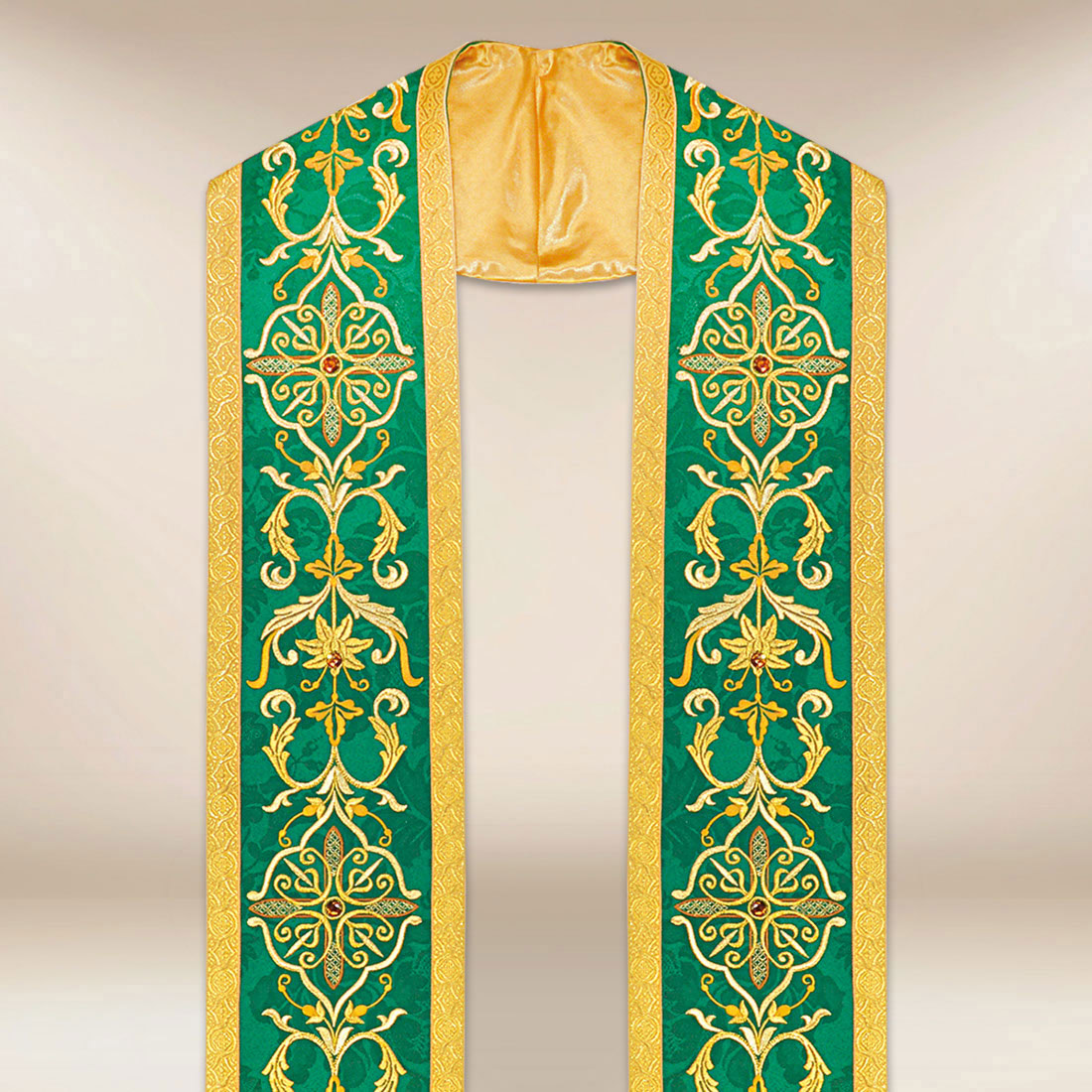 La veste è realizzata in tessuto jacquard di alta qualità, noto per la sua morbidezza, durata e delicato lucido. Il sottile motivo floreale ne esalta il carattere rappresentativo, mentre il ricamo preciso realizzato con filo dorato conferisce armonia e bellezza sacra all’insieme. L’ornamento ispirato a motivi vegetali classici è stato progettato con attenzione ai dettagli, rendendo la stola romana ricamata verde distintiva sia per estetica che per profondità simbolica.