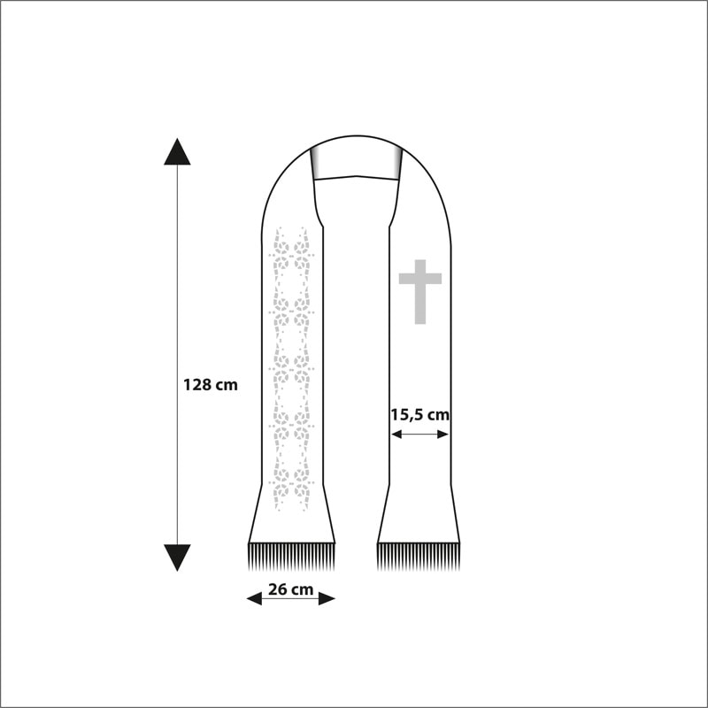 La stola ha una taglia universale, adattandosi a ogni sacerdote e costituendo un complemento armonioso per le casule di colore verde. Il tessuto è leggero e piacevole al tatto, garantendo comfort anche durante lunghe celebrazioni. Il set include due colli tagliati al laser, che facilitano una disposizione estetica della stola e assicurano un aspetto impeccabile per tutta la durata della liturgia.