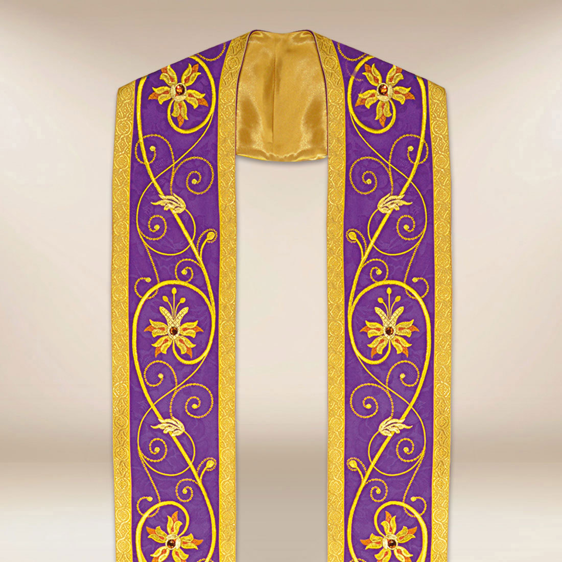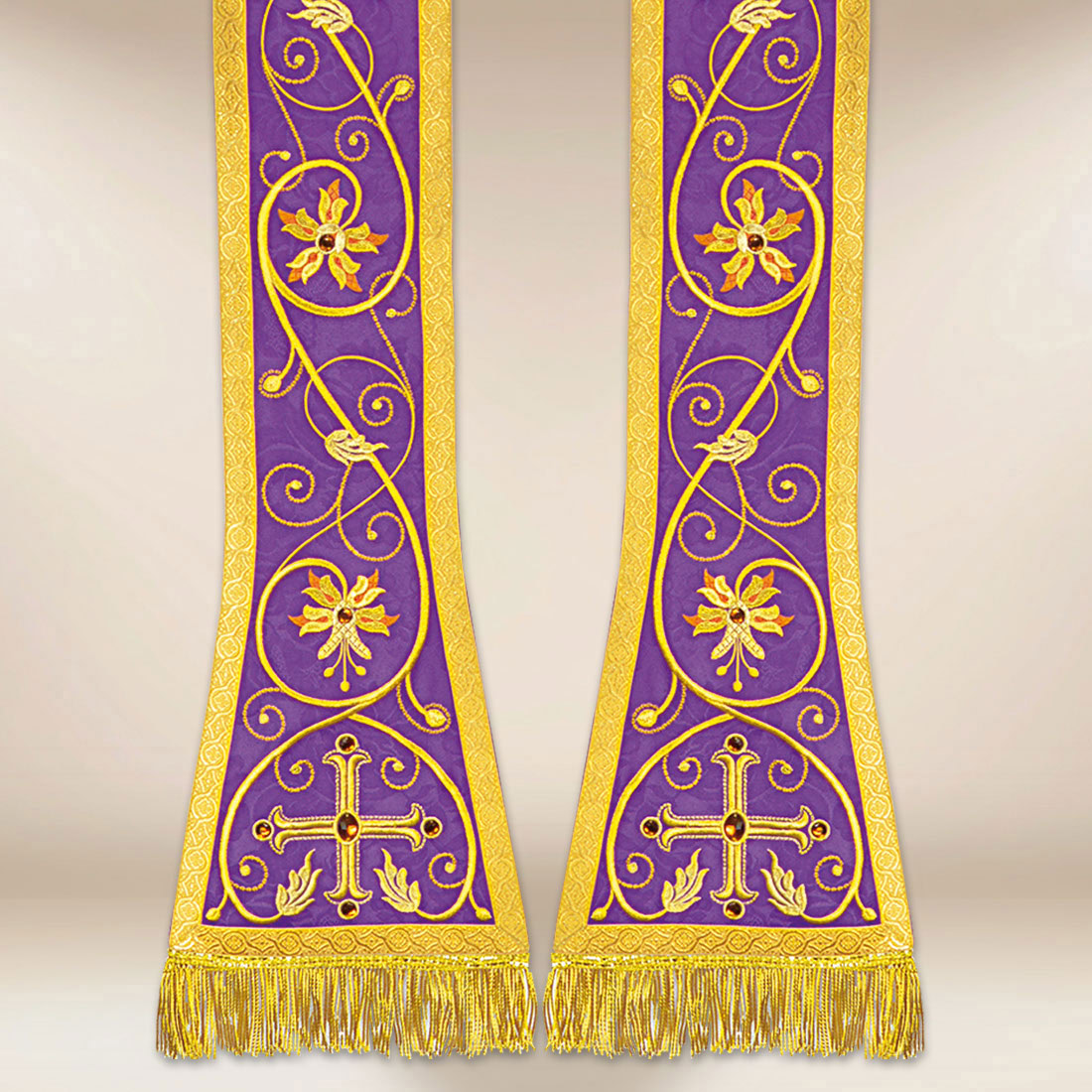 Il ricamo elaborato realizzato con filo dorato crea una composizione ispirata agli ornamenti sacri classici. Le pietre incastonate a mano aggiungono un accento luminoso, riflettendo splendidamente la luce durante le celebrazioni. Grazie a ciò, la stola liturgica ricamata romana viola si presenta in modo eccezionalmente dignitoso sia da vicino che nello spazio del tempio. Nella parte inferiore è posizionato un croce decorativa in stile romano, che costituisce un chiaro accento sacro e sottolinea l’importanza di questa forma di stola.
