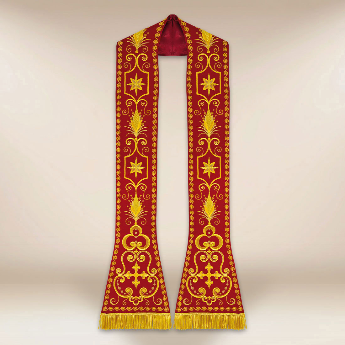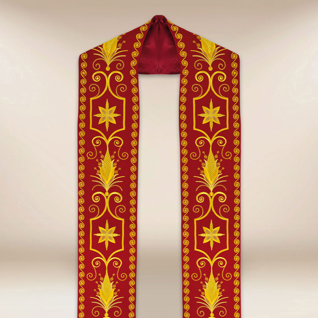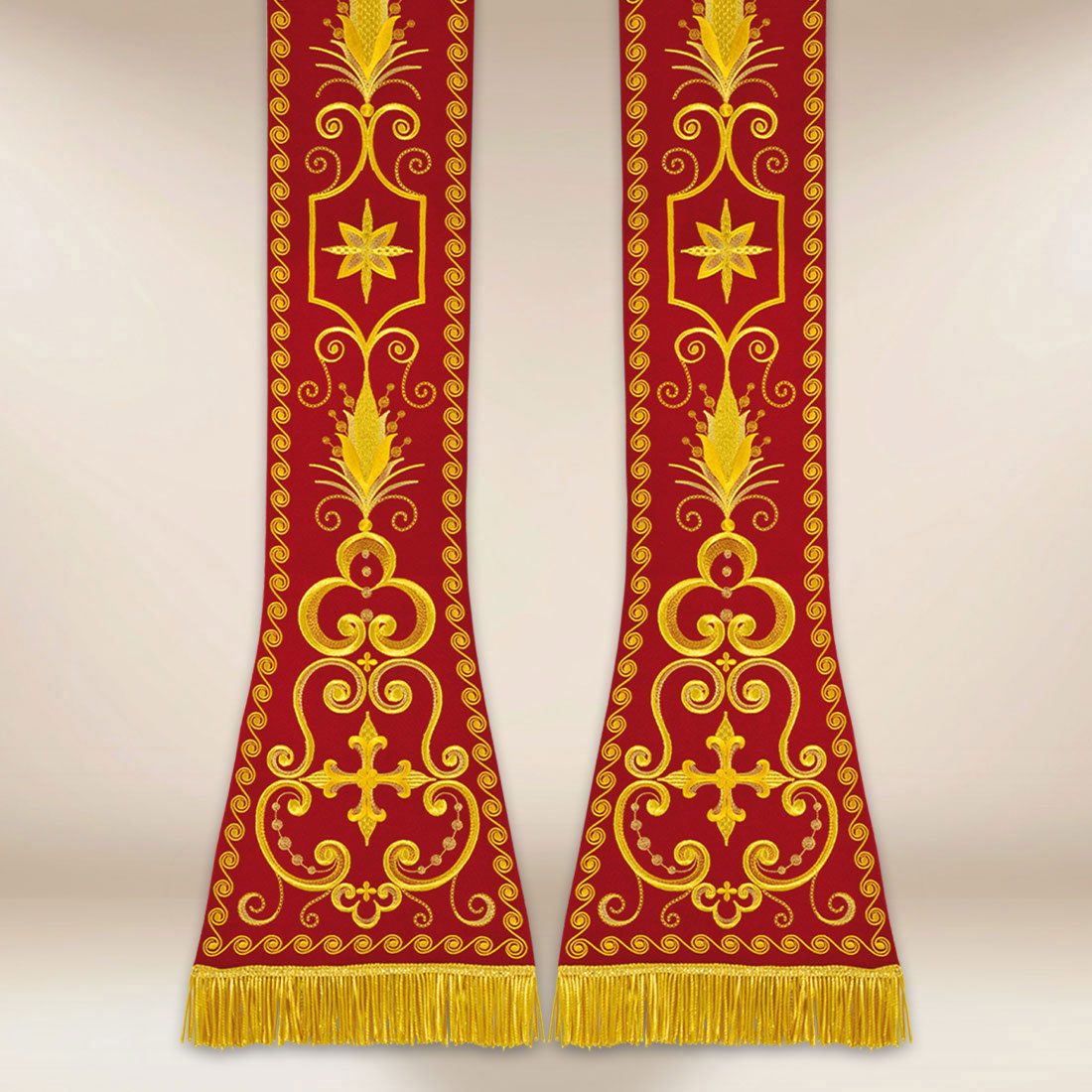Grazie a una cucitura accurata e a un design armonioso, la stola ricamata romana rossa si abbina perfettamente agli ornati e ai piviali della stessa tonalità liturgica, creando un insieme coerente e solenne. La veste è adatta per le Messe in onore dei martiri, le celebrazioni della Pentecoste, le liturgie a tema pasquale e altre celebrazioni in cui il rosso ha un significato particolare.