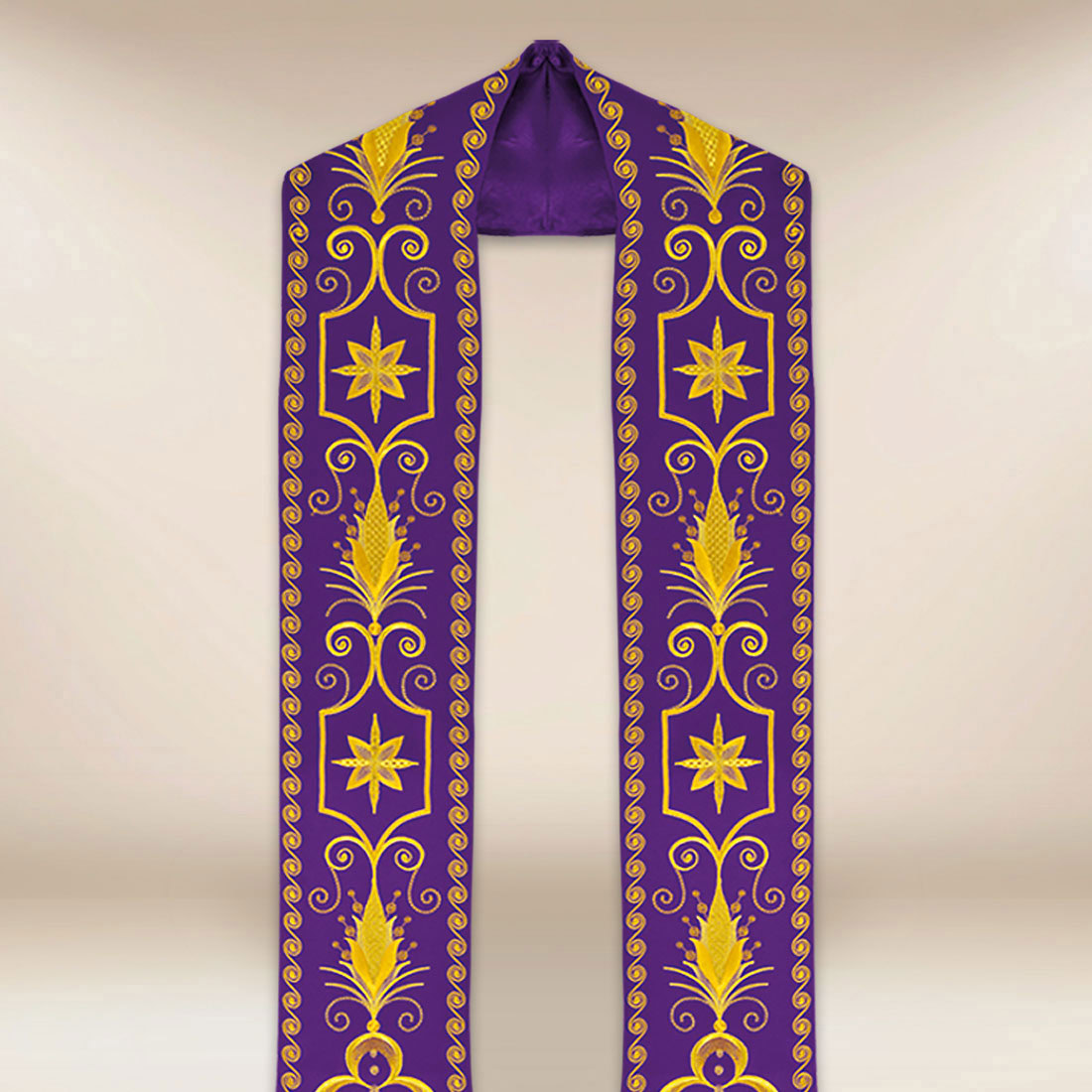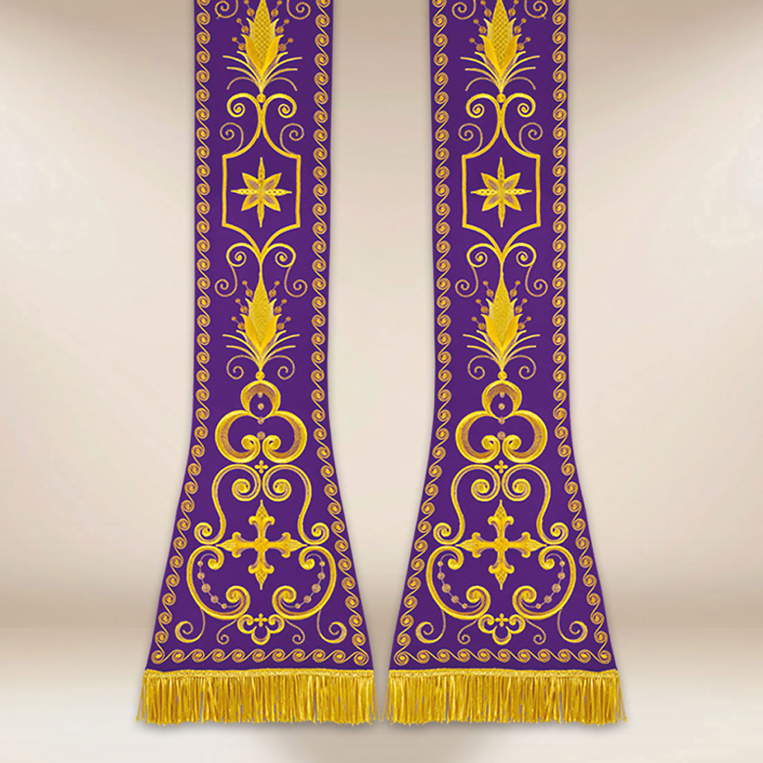 Il tessuto utilizzato è leggero, morbido e piacevole al tatto, consentendo al sacerdote di muoversi liberamente durante la liturgia. La stola mantiene un aspetto elegante sia in movimento che durante le parti più tranquille della celebrazione. Si abbina a casule, piviali e dalmatiche classiche in tonalità viola, creando un insieme liturgico armonioso.