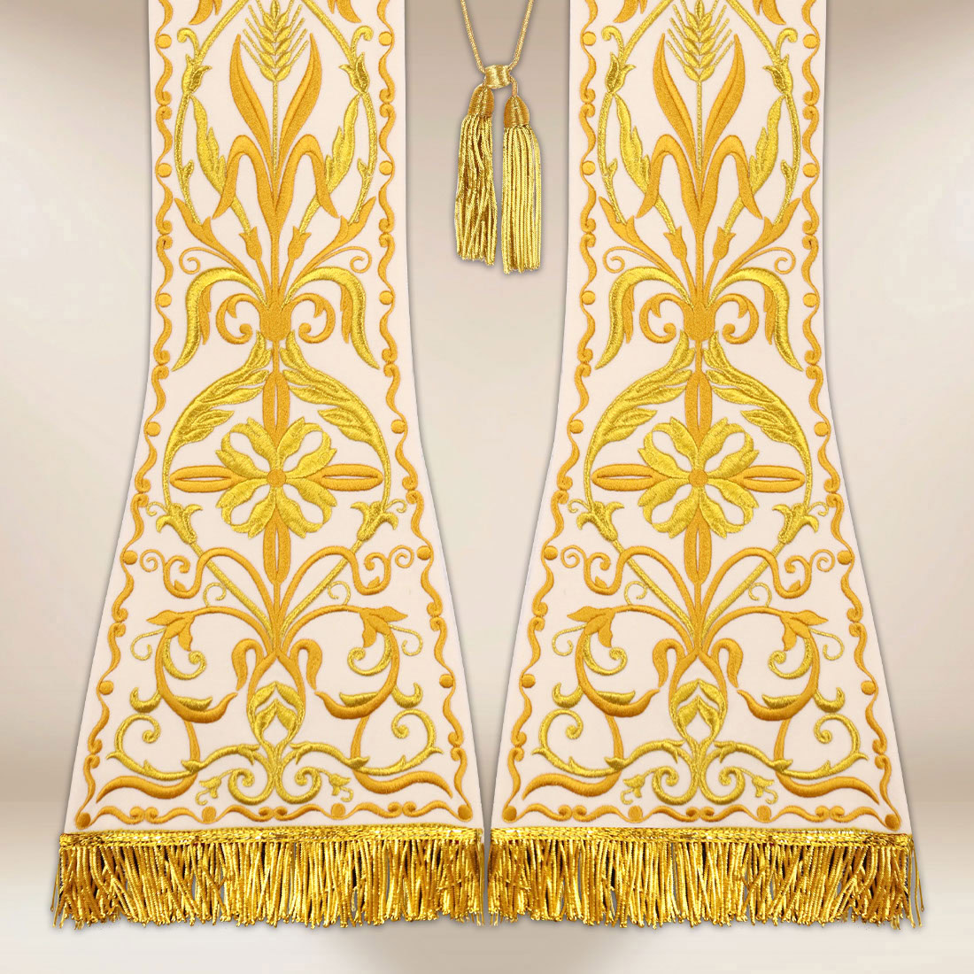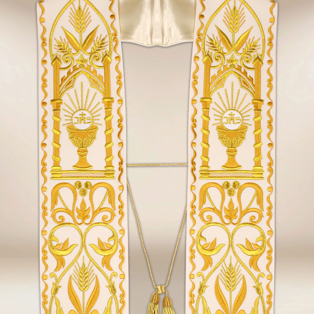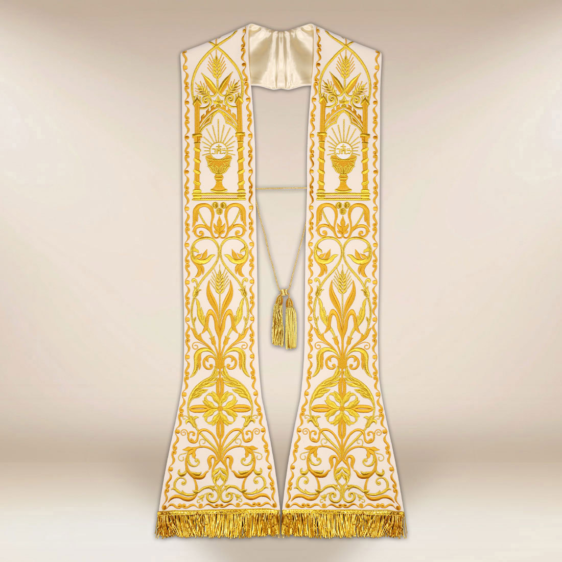 La stola ricamata romana Calice ecru è un paramento creato per celebrazioni di particolare solennità e carattere eucaristico. Il suo motivo centrale è un calice ricamato con l’ostia, presentato in un contesto di spighe, foglie e linee decorative che conferiscono alla composizione armonia e bellezza sacra classica. Il tutto è realizzato con filo dorato, creando un elegante contrasto con lo sfondo chiaro del tessuto in velluto.