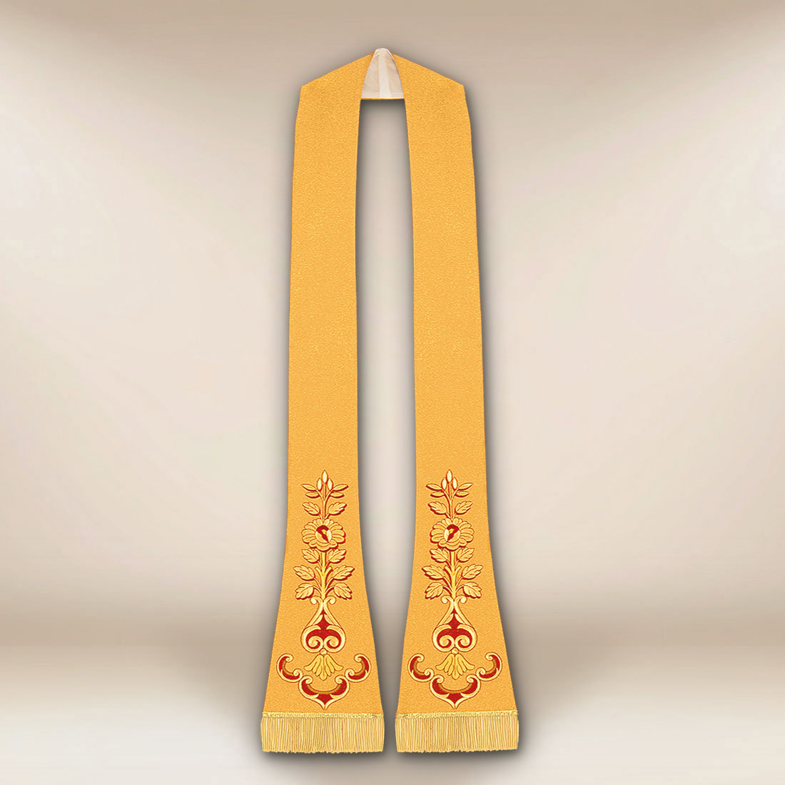 La stola romana ricamata in oro è realizzata in tessuto di alta qualità con effetto lamé, che riflette delicatamente la luce, conferendo all’indumento un carattere dignitoso e solenne. La struttura del materiale, che rappresenta un’armonica combinazione di fibre naturali e sintetiche, garantisce durata e comfort anche durante celebrazioni prolungate. Il tessuto si adagia in modo morbido e stabile, permettendo alla stola di mantenere una bella linea senza necessità di ulteriori rinforzi.