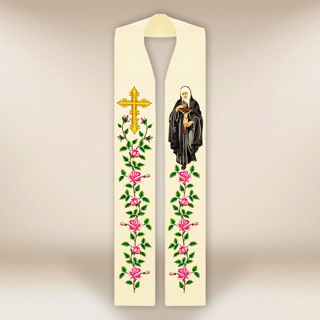 Lungo tutta la lunghezza della stola corre un elaborato ricamo di rose in delicate sfumature di rosa. Questo motivo richiama i miracoli, le grazie e la bellezza spirituale associata a S. Rita, conferendo alla veste leggerezza e armonia. Grazie a ciò, l’ornamento rimane elegante, ritmico e pienamente liturgico, facendo sì che la stola ricamata S. Rita si presenti in modo eccezionale sia in movimento che in posizione statica.
