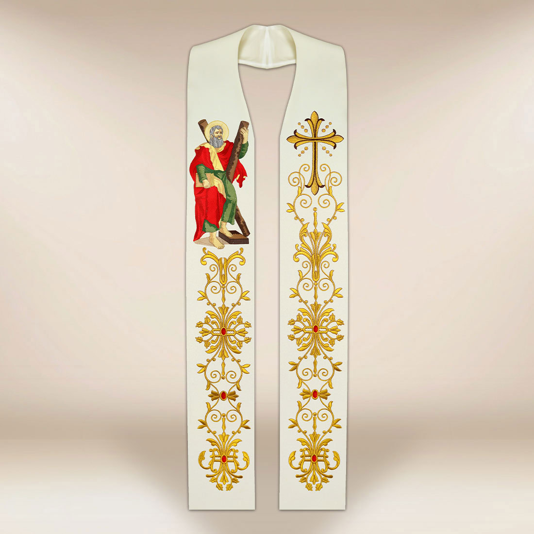 Ogni stola è accompagnata da colli tagliati al laser, che aiutano a mantenere la corretta disposizione del paramento e aumentano il comfort di indossarla. Stola ricamata con l’immagine di San Andrea si adatta particolarmente bene durante le celebrazioni in onore di San Andrea, le celebrazioni patronali e le liturgie legate alla commemorazione degli Apostoli.