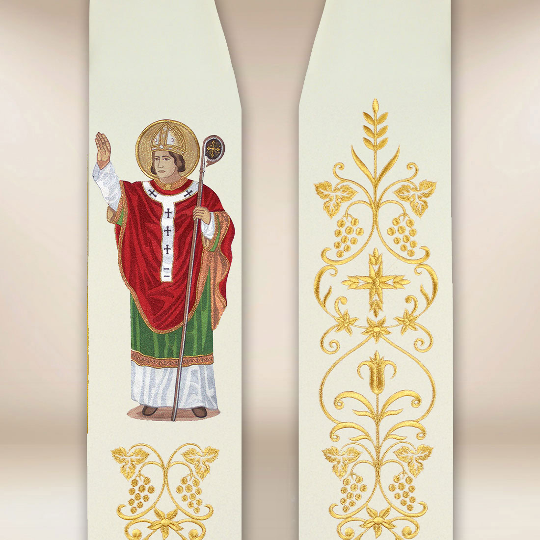 Stola ricamata con l’immagine di San Stanislao è stata progettata come veste liturgica che sottolinea il patrimonio spirituale della Chiesa in Polonia e la testimonianza di fede di uno dei suoi patroni più importanti. L’immagine di San Stanislao, vescovo di Cracovia e martire, ricorda la responsabilità del pastore verso il popolo affidato, il coraggio nella difesa della verità e la fedeltà a Cristo fino al sacrificio della vita. Su uno dei pannelli è stato realizzato un ricamo accurato che rappresenta il santo in iconografia classica — con il pastorale e la mitra vescovile, nel gesto di benedizione, che simboleggia la protezione spirituale sulla comunità dei fedeli.