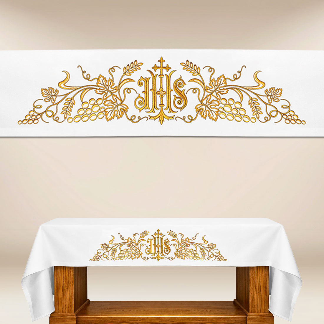 Runner con ricamo IHS dorato si distingue per la sua elegante stilistica, che si armonizza perfettamente con il significato liturgico del simbolo del nome di Gesù. Il ricamo presenta il monogramma IHS al centro della composizione, circondato da un ornamento dorato e da un motivo di uva. Il simbolo della vite nella liturgia si riferisce all’Eucaristia, al vino trasformato nel Sangue di Cristo, conferendo alla decorazione una profonda dimensione teologica.